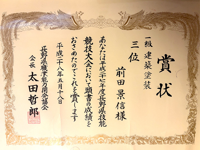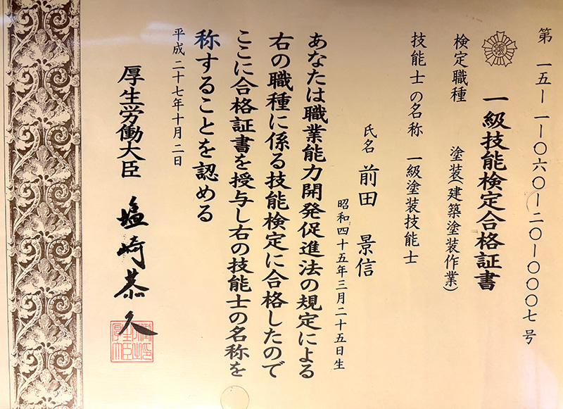 前田塗装は、建設業許可(塗装工事業)を取得しています。これは一定以上の技術力・経験・体制を満たした業者だけに与えられる公的な許可です。個人のお客様にとっても、トラブルの心配なく安心してご依頼いただける一つの目安になります。小さな工事から大きな施工まで、きちんと対応できる体制を整えています。
